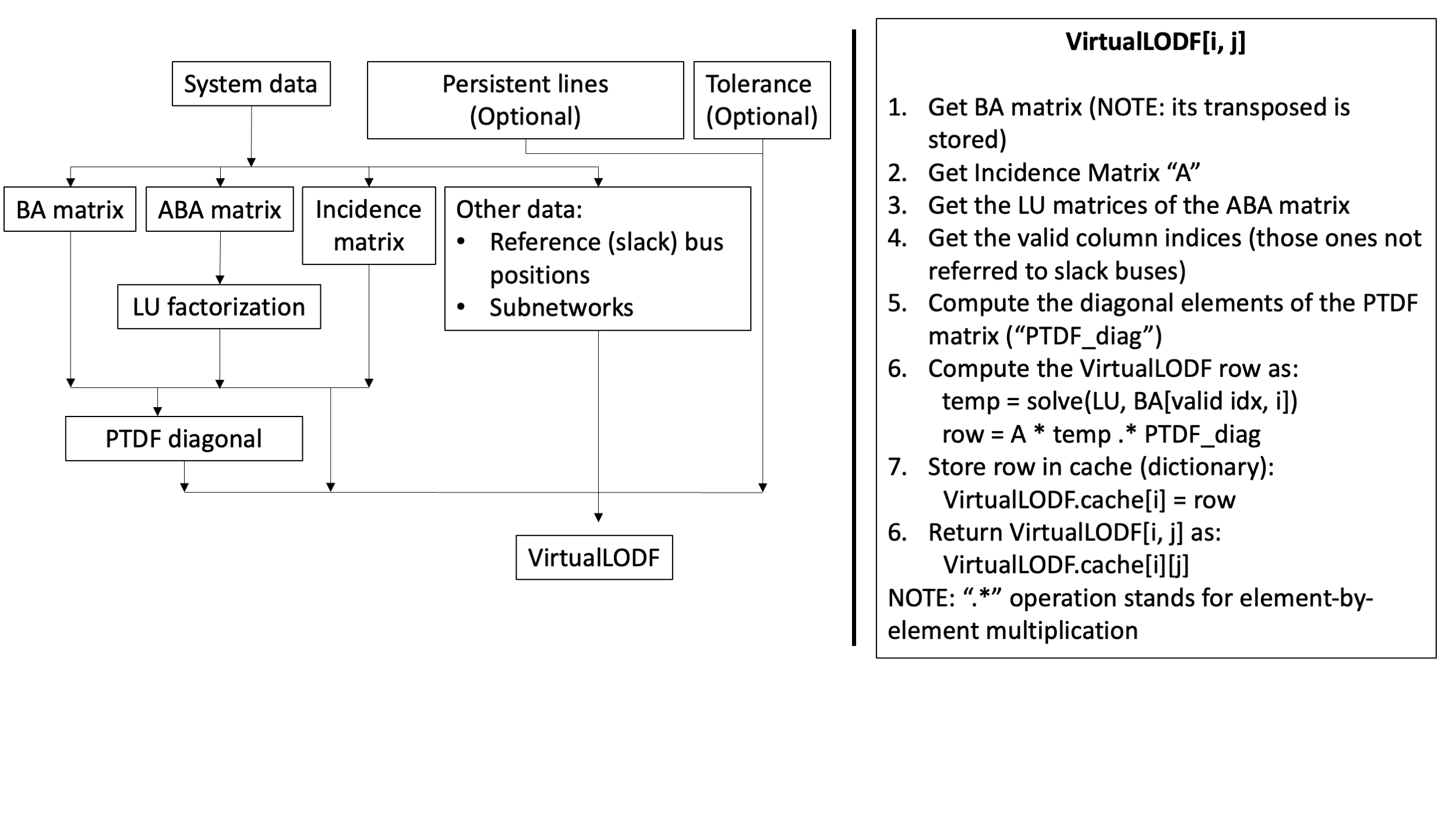 Starting from the system data, the IncidenceMatrix, BA_Matrix and ABA_Matrix (with relative LU factorization matrices) are evaluated. The ABA_Matrix and BA_Matrix are used for the computation of the diagonal elements of the PTDF matrix, and this vector is stored in the VirtualLODF structure together with the other structures mentioned above.