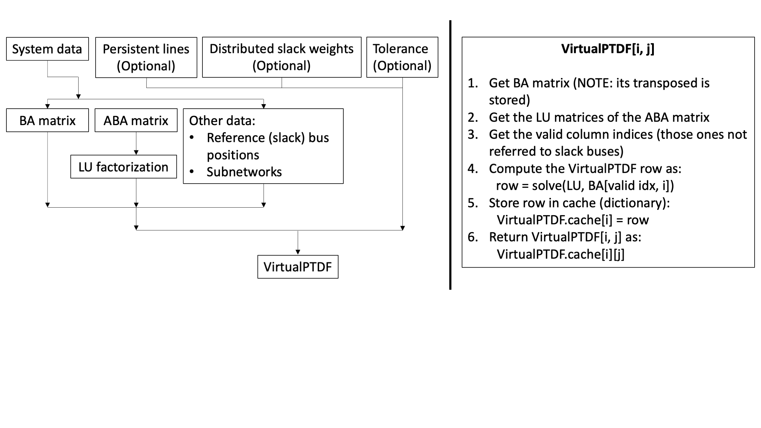 The VirtualPTDF is a structure containing everything needed to compute any row of the PTDF matrix and store it. To do so, the VirtualPTDF must store the BA matrix (coming from the BA_Matrix struct) and the inverse of the ABA matrix (coming from ABA_MAtrix struct). In particular, KLU is used to get the LU factorization matrices of the ABA matrix and these ones are stored, avoid the inversion.
